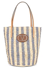 Valentino Garavani Crochet Raffia VLogo Signature Small Bucket Bag in Azzurro, Naturale, Natural Camel, & Selleria
